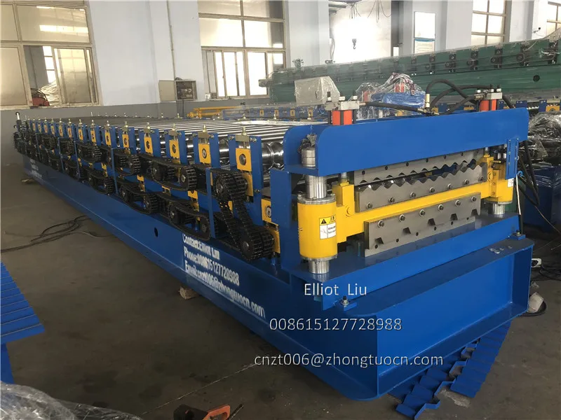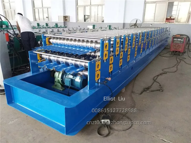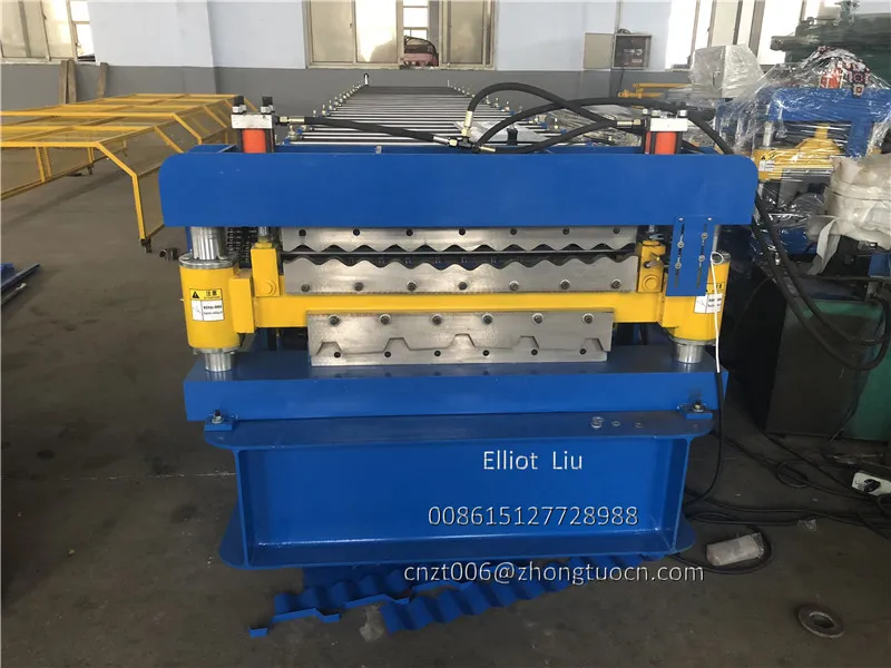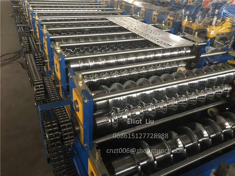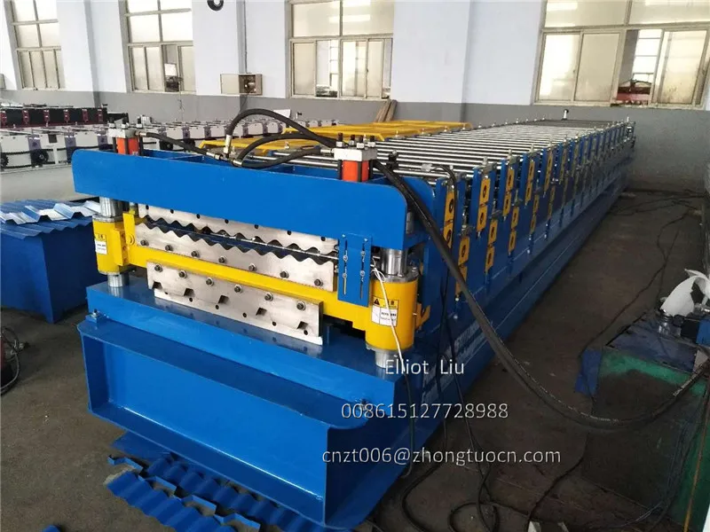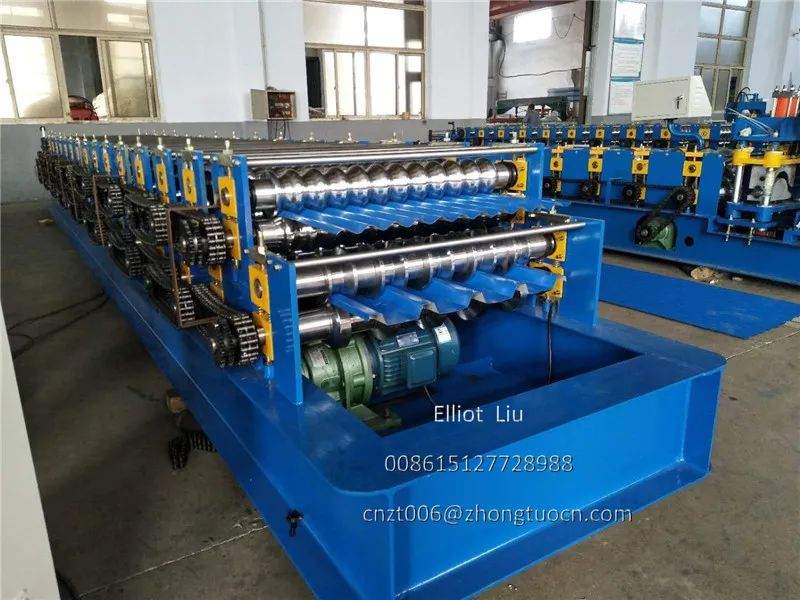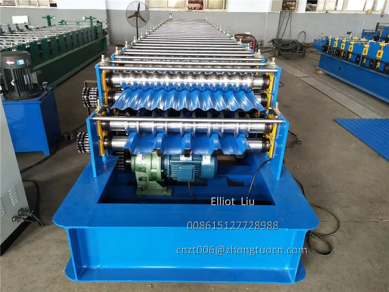 Double layer roofing tile machine: can produce two type sheets, one corrugated sheet and one IBR sheet. The input material are both 1000 mm width with thickness 0.3-0.8mm. Machine speed 8-12 m per minute. With pre-cutting device and double inches chain. This machine cheaper and stable. Widely used in South America zone. Expecially Bolivia. We can also supply you the PPGI and GI coils. We know some good supplier. We can put the coils with the machine in the same container.