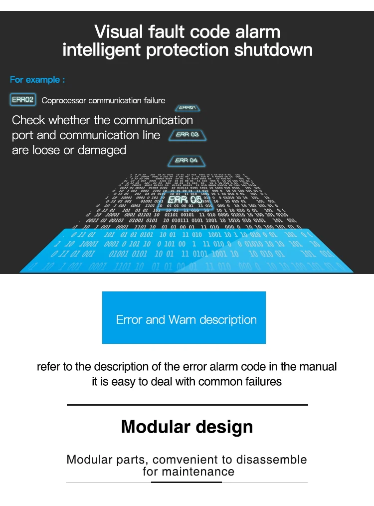 | Power supply: 380V 3Phase 50HZ/60HZ | Abnormal alarm system:Self-diagnosis LED Display |