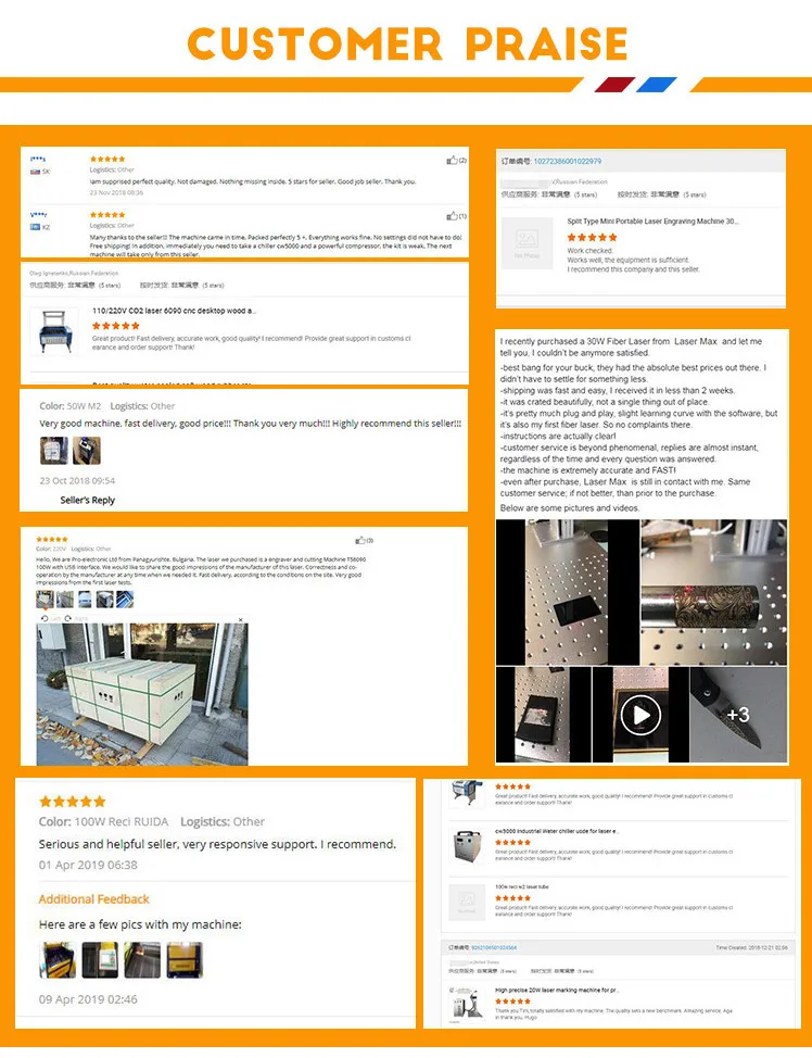 ##Almostly, we will send you free spare parts with machine, after you open the package, you install it with our instructions, if budegt enough, you can buy a water chiller CW3000 or CW5000 together with machine for better cooling laser tube. If not enough,