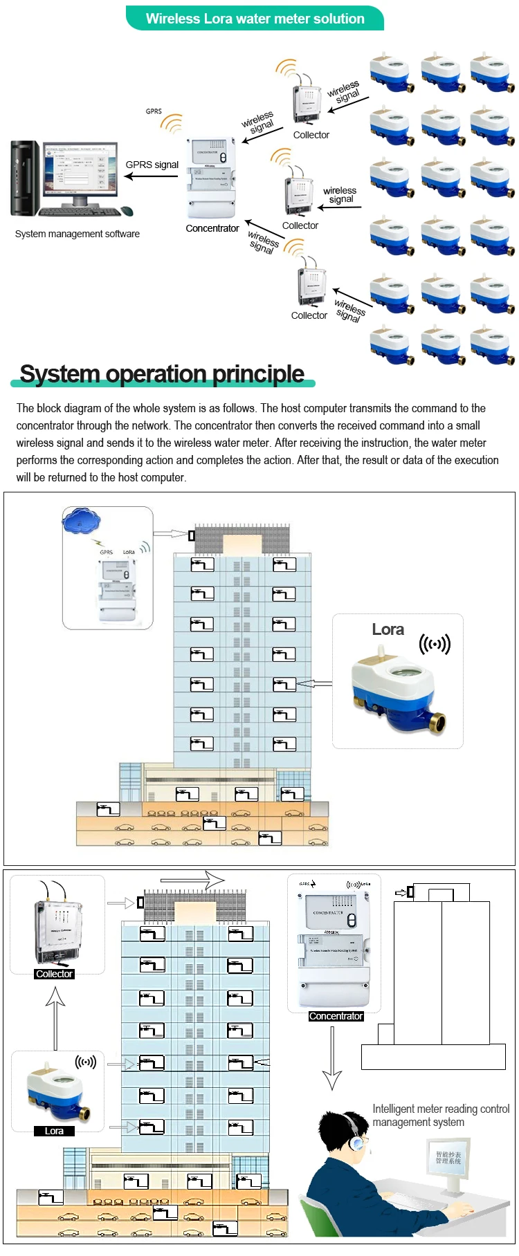 Wireless remote meter is based on the wired remote meter, added the wireless module, the water meter has a routing function, construction and installation is simple, convenient, the network process automatically completed, solved the complex wiring construction problems. Wireless valve remote control water meter is based on the wireless remote meter, added the valve control function, solved the problems that user maliciously arrears of water charges, charges difficult, achieved a remote real-time monitoring and remote switching valves and prepaid functions. Valve Controlled Wireless Remote Reading Smart Water Meter