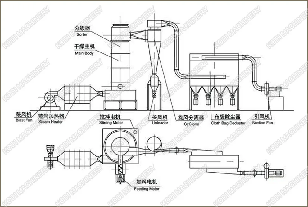 Hot air enters the stirring part of drying chamber from the bottom, material is stirred by stirring device and then the hot air exerts strong shearing, blowing, floating and rotating effect to material. Therefore material is crushed by centrifugal, shearing, impacting and friction effect. It strengthens the heat exchanging process. In the bottom of drying chamber, big and damp granules are crushed by stirring device, the particles with low moisture content and small size are lifted by rotary air stream, and be further dried. Gas and solid two phases rotary flow, inertia of solid phase is bigger than gas phase, the relative velocity between gas phase and solid phase is high, heat exchanging efficiency is strengthened, so the drying intensity of this machine is high.