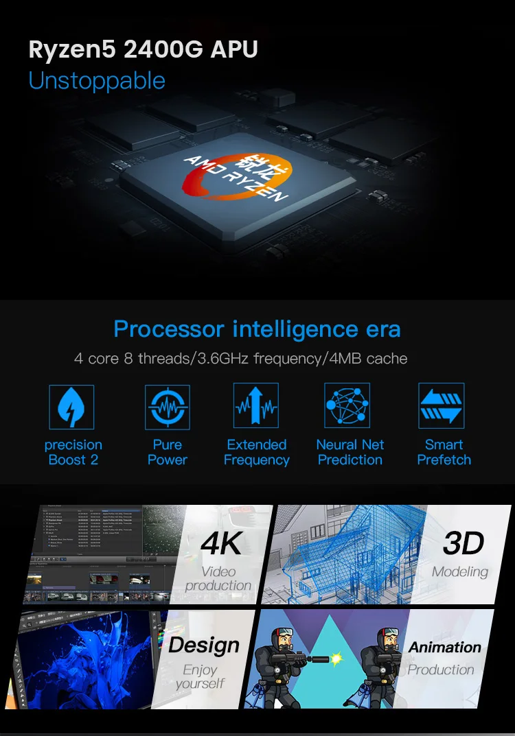 | CPU | AMD Ryzen 5 2400G/3400G (3.6-3.9Ghz / 4 Cores 8 Threads) |