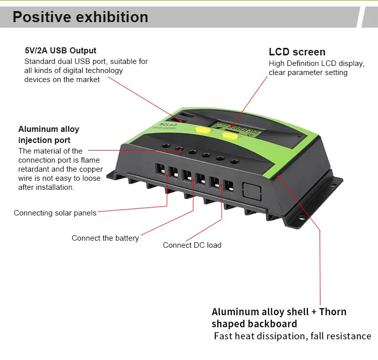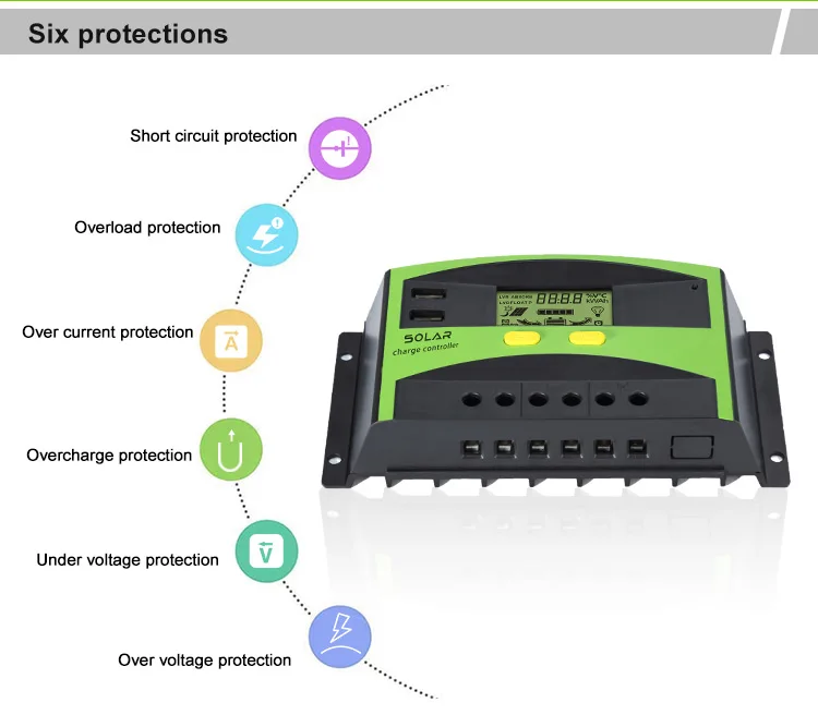 Intelligent PWM charging mode, higher charging efficiency, with overcharge, over discharge, lightning protection, anti reflux, overheating protection.