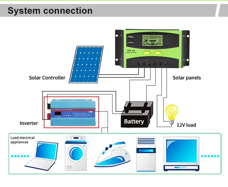 | Solar controller(PWM/MPPT) | Battery charger | Battery |