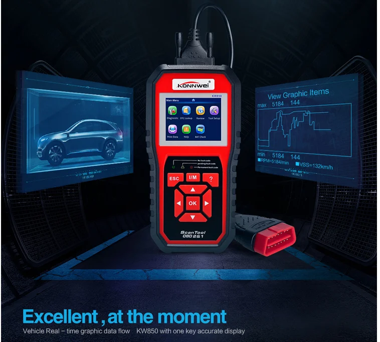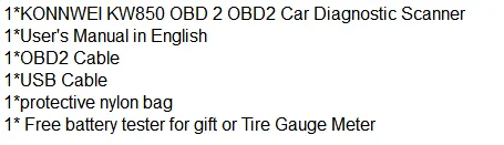 The KONNWEI KW850 OBD2 / EOBD / CAN Car Diagnostic Scanner supports all 10 OBDII test modes on all OBDII compliant vehicles for a complete diagnosis. Featuring the unique patented One-Click I/M Readiness Key, TFT color display and built-in speaker, Real Time Battery Voltage Monitoring, the KONNWEI KW850 is truly the ultimate in power and affordability, allowing users to do their jobs faster.