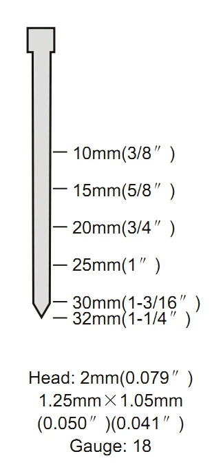FEATURE • "Contact mode" safety system • Light die cast body of aluminum alloy • Side loading system • Remain nail display available • Nail Size: 1.25mm x 1.05mm • Nail Length: From 10mm to 32mm
