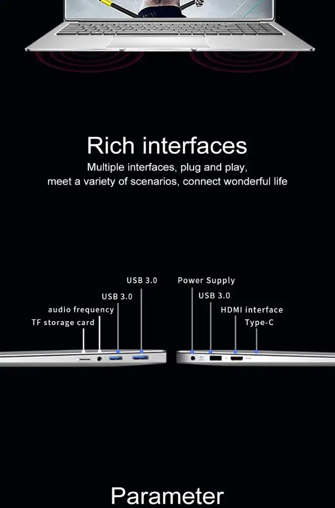 | Interface: 2* USB 3.0,1*Type C, 1* DC charging, 1* mini SD Card Slot, 1* Micro HDM,1* 3.5mm headphone jack,1*RJ-45. |