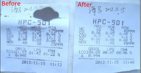 Reduce HC discharge (hydrocarbon) by 60.42%, CO 16.67%, CO2 20%. The fuel oil can be saved immediately by 10% and reach to 20% after running 500km. Do carbon cleaning one time every year, drive new car every day. It can prolong the engine life.