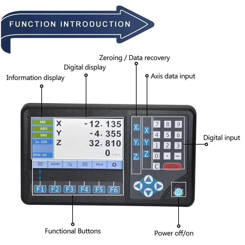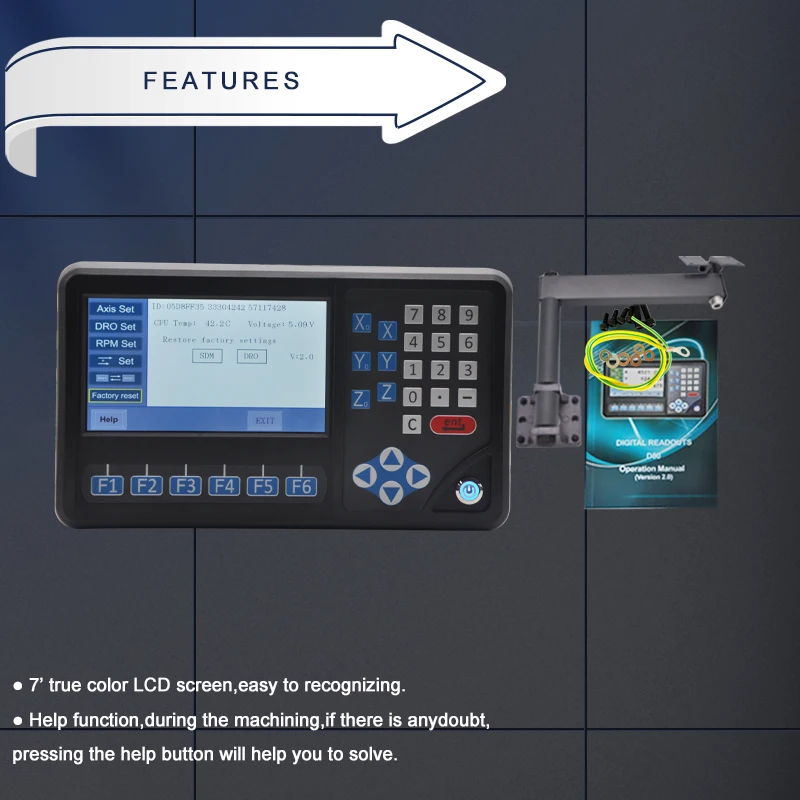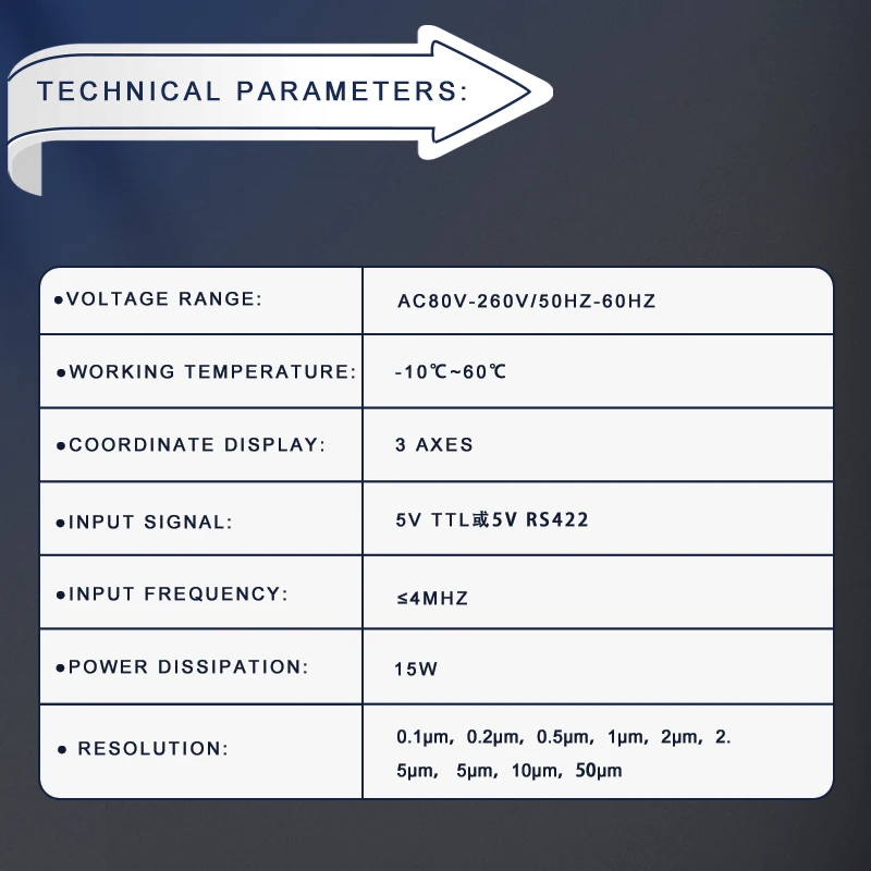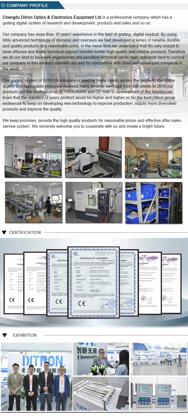 10) Linear scale Grating space: 0.04mm, 0.02mm, 0.01mm, power supply is +5V.the difference between two and four TTL output signal is 90°.