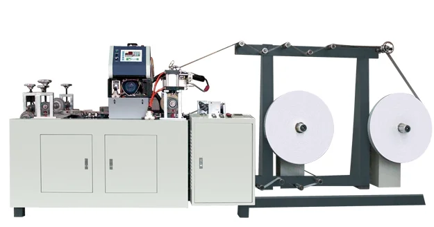 This machine is mainly supporting semi-automatic paper bag machines. It can quickly produce flat paper handle, which can be attached onto the paper bag without handles in further production and make it into paper handbags. This machine takes three paper rolls as raw material and pastes paper patch and flat paper ropes together. Finally they are to be cut into flat paper handles.