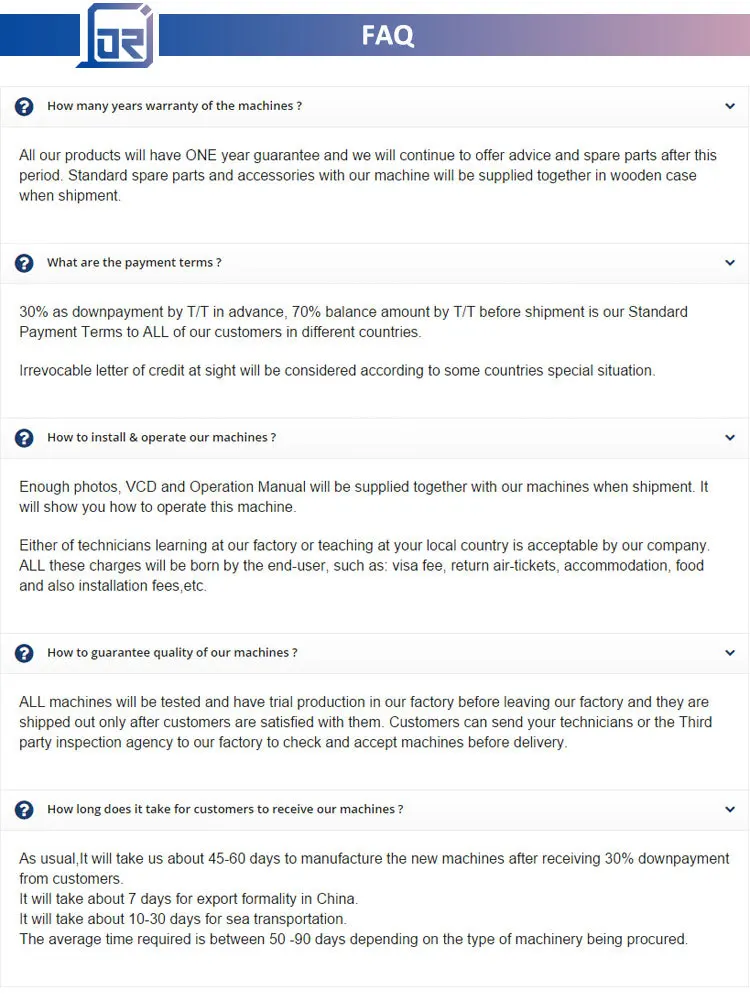 6. Upon receiving our machines, JORI will start to supply our promptly After-sales service for you. Any questions can be solved as soon as possible by our Customer Service Representative.