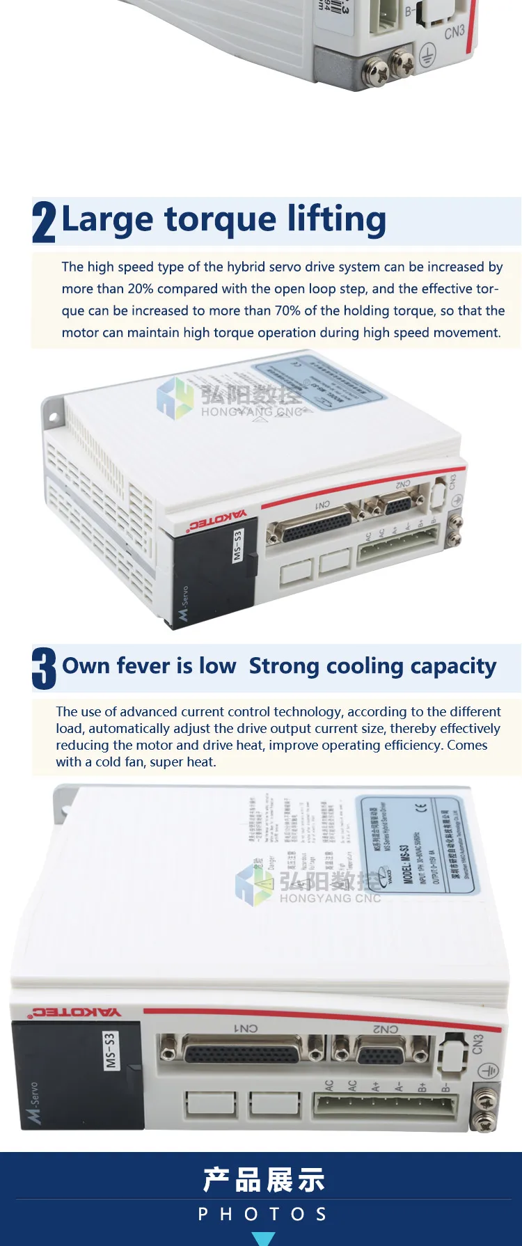 MS-S3 series servo-stepper drive is the latest technology of YAKO. It combines 32-bit DSP motor control technology and power angle control technology, thus completely solved the problem of losing step.