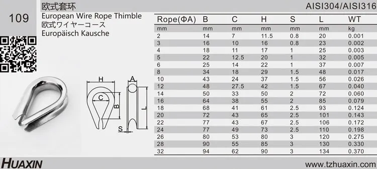 Wire rope thimbles are made from grade 304 stainless steel and grade 316 stainless steel, ss316 is better than ss304 in corrosion resistance and rust prevention, if their application areas are very bad like marine and biogas..., we recommend you choose grade 316 stainless steel, If not, SS304 is good enough.