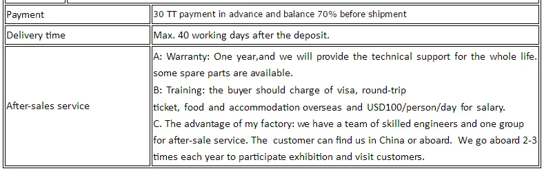 3. Oversea service: the buyer should charge of visa, return ticket, food and accommodation overseas and USD 80/person/day salary.