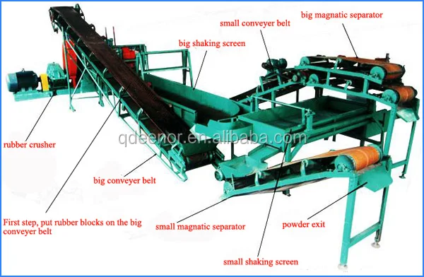 6. conveyor belt, oscillating screen, magnetic roller: To separator the iron power and rubber power and screening the rubber power, make the big rubber power re-milling.