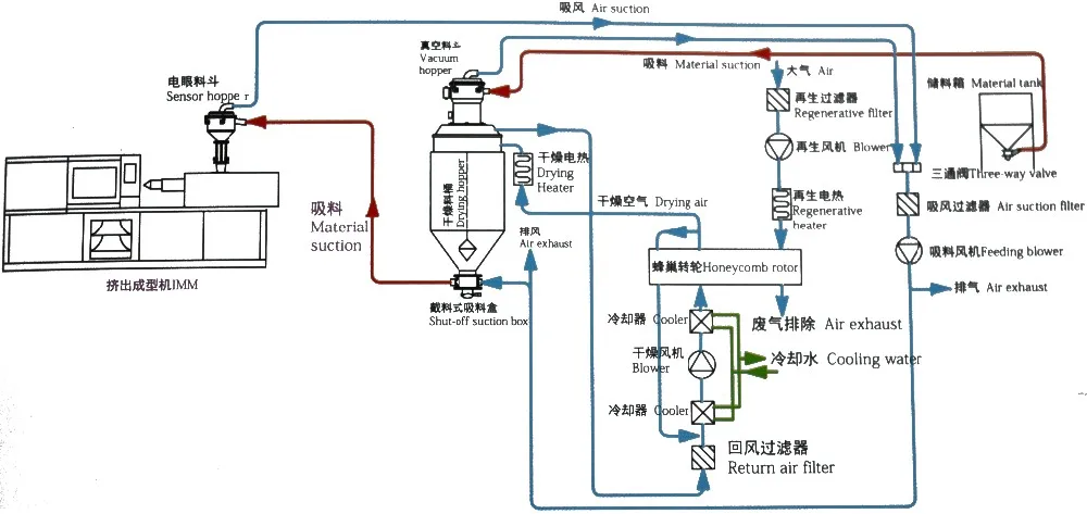 5) Integration of three functions in one machine, namely dehumidifying, drying and two-section material conveying. Three-section or four-section material conveying is also optional.