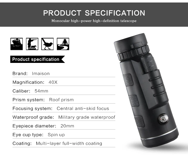 | Product name: | Monocular telescope High - definition telephoto zoom camera lens; | Magnification: | 40X; |