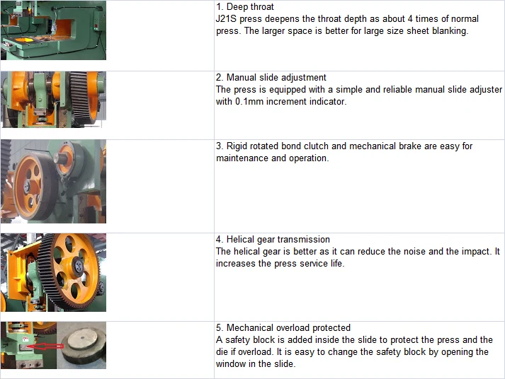 J21S series of press machine deepens the throat, and its throat depth is four times of that of common machine. The J21S series has large work space, and it can finish the forming in one punch without turning around. It is widely used for the machining of large size plates, and all the J21S series adopt steel plates welded machine body with high strength and rigidness. The machine has reliable performance and works smoothly.