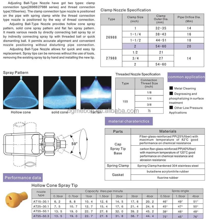 Adjusting ball-type nozzle have got two types:clamp connection type and thread connection type.The clamp connection type nozzle is positioned on the pipe with spring clamp while the thread connection type nozzle is positioned by the way of thread connection. Adjusting ball-type nozzle provides hollow cone spray pattern,solid cone spray pattern and flat fan spray pattern.It meets various needs by directly connectiong ball spray tip or by indirectly connecting spray tip with threaded ball or quick dismanting ball.It permits accurate alignment and convenient nozzle positioning without disturbing pipe connection.Adjusting ball-type nozzle allows for quick and easy tip replacement.Spray tips can be removes without the use of tools,removing the existing spray tip by hand an installing the new tip.