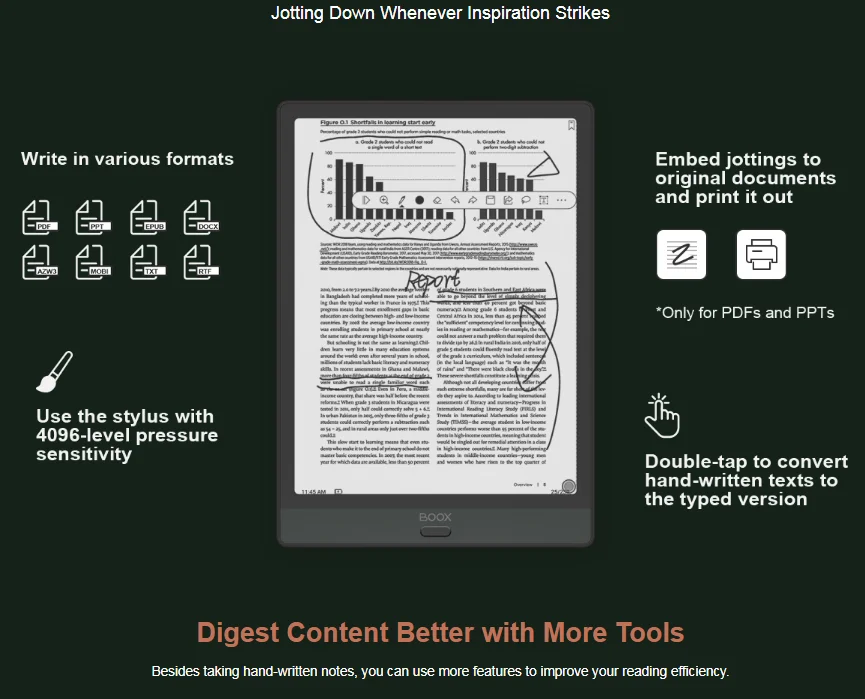 One of the main-trend eReader brands BOOX, created and owned by Onyx, has enjoyed great popularity on the international markets since 2009. Aside from the classic 6″ E Ink eReaders, Onyx is typically famous for its large-screen Android-based E Ink tablets such as 13.3″ BOOX Max3 and 10.3″ BOOX Note Pro. Onyx is the World’s first company applies Android 9.0 OS to eReaders, which is a significant revolutionary movements occurred in this industry. In the past ten years, Onyx products have been sold to over 60 countries of 4 continents globally. And in the future, besides eReaders, our company will also embark on other promising E Ink devices that stay ahead of the market. With a highly professional team in software and hardware development, we offer one-stop solutions to distributors, publishers, education industries and any potential business partners.