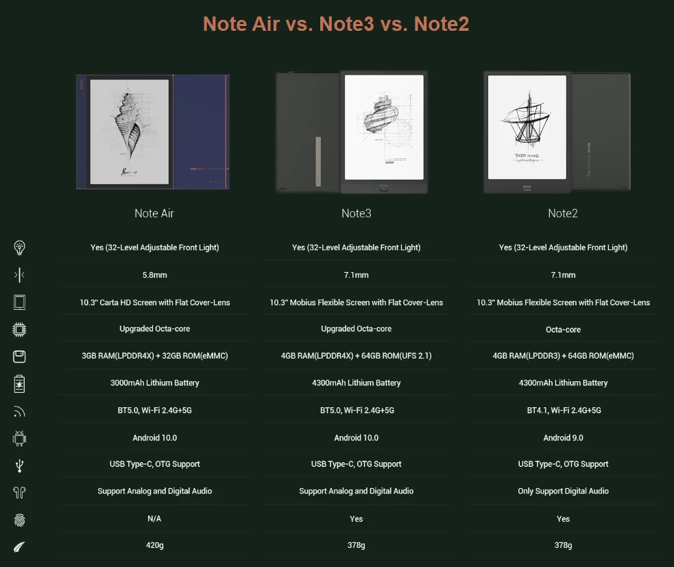 | Display | 10.3 " E ink Mobius flexible screen with AG glass flat cover-lens | |