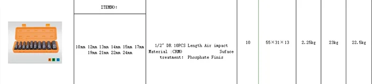 | Packaging Detail: | 1/2 Inch 10 Pcs Professional High Quality Deep Air Impact Socket Set 1)10pcs/set 2) customized color box /OEM; | Supply Ability: | 999999 Set/Sets per Month; |