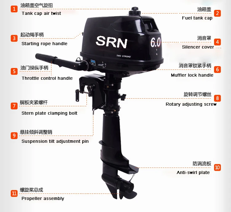 1. The first 10 hours of the new machine belongs to the running-in period. The new machine needs to be added to the 4-stroke engine oil for the outboard machine. Please refer to the instruction manual for the amount of oil (connect the oil pipe, the oil pipe arrow is connected to the upper end of the oil pipe, and loosen the ventilation on the fuel tank cap. Bolts, pump oil, propellers and water inlets are placed in the water. The gear position is in the neutral position. Pull out the choke valve and insert the red flameout rope to start the engine. Immediately after the machine starts, push back the choke.