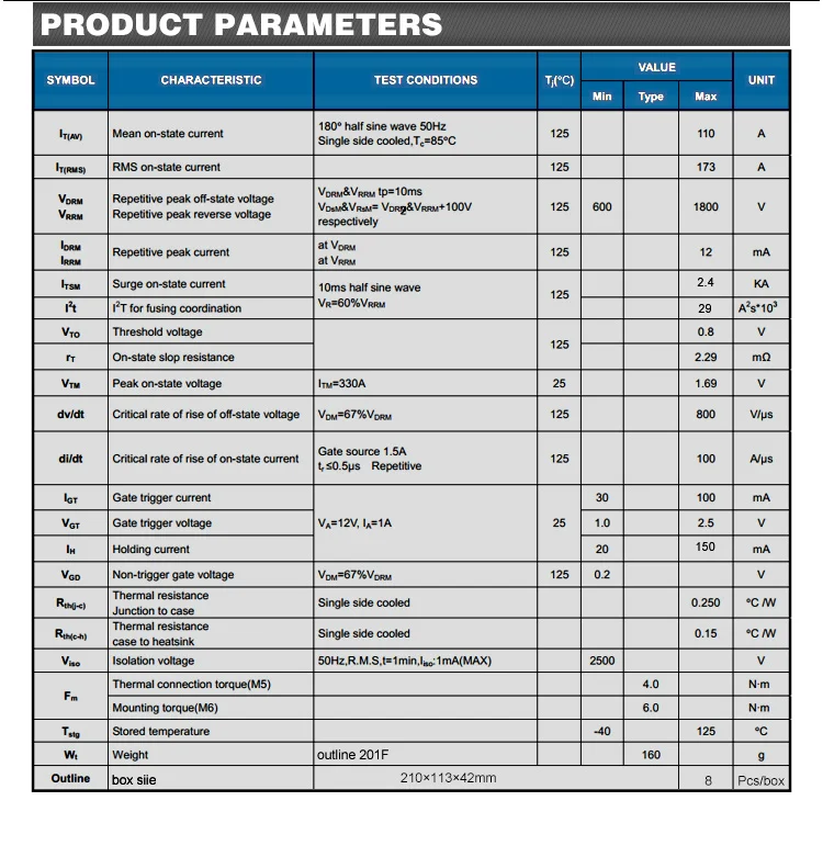 2. Q: How does Lujing control the product quality? A: 100% of the products will be tested . Firstly we will test chip parameters . After the chip encapsulation . we test 100% of the thyristors again. Each chip and thyristor should pass all these QC procedures before shipping to customer.And we will deliver goods with all testing parameters wrriten in the paper.