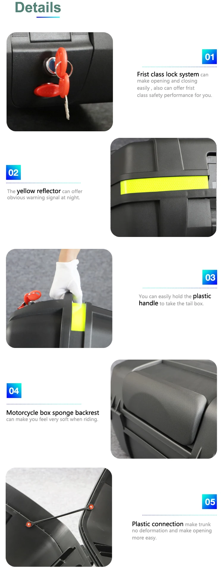 | Packaging Detail: | Each piece with one plastic bag and quality carton for New motorcycle tail box , motorcycle trunk and motorcycle delivery box with good price.; | Quality: | Meet International Stand; |