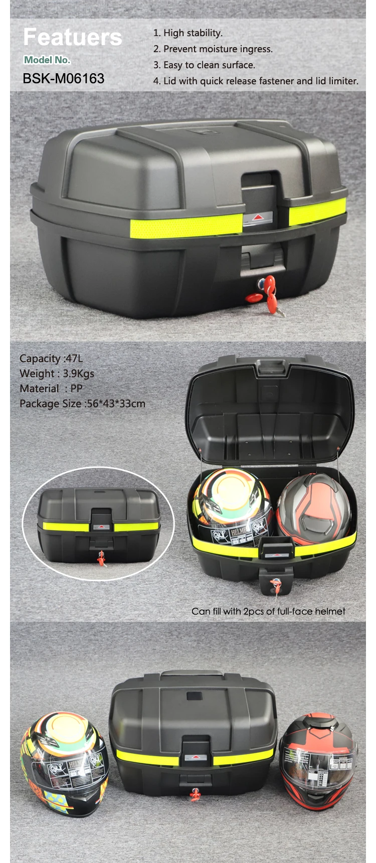 | Volume: | 47L; | Model Number: | BSK-M06163 Motorcycle trunk; |