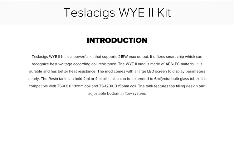 Teslacigs WYE II Kit is a powerful kit that supports 215W max output. It utilizes smart chip which can recognize best wattage according coil resistance. The WYE II mod is made of ABS+PC material, it is durable and has better heat resistance. The mod comes with a large LED screen to display parameters clearly. The Resin tank can hold 2ml or 4ml e-juice, it also can be extended to 6ml(extra bulb glass tube). It is compatible with TS-XX 0.18ohm coil and TS-120X 0.15ohm coil. The tank features top filling design and adjustable bottom airflow system.