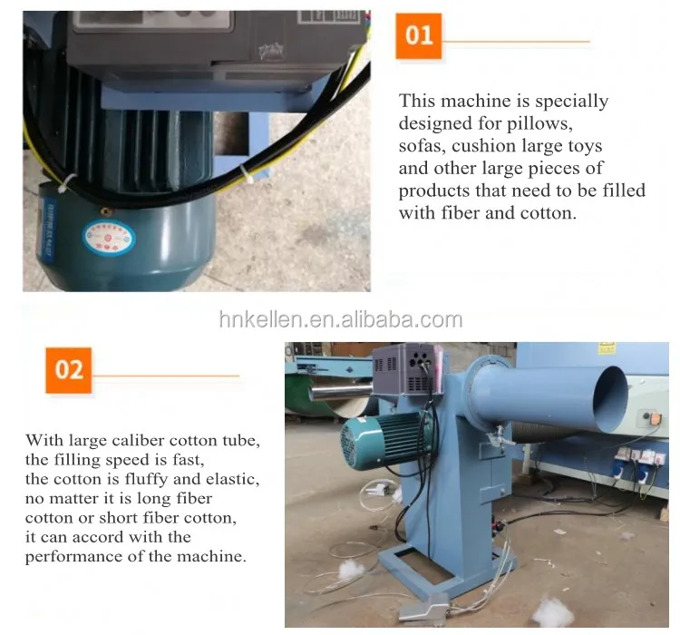 (1)This machine is specially designed for pillow, sofa, cushion and other large-caliber cotton fiber and cotton products. With the large-caliber cotton tube, the filling speed is fast, the filled cotton is fluffy and won't be rolled into grains. The product is flexible and elastic.
