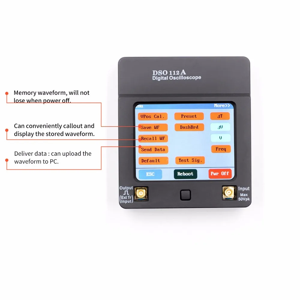 DSO112A is a pocket oscilloscope with color display and touch panel. What makes DSO112A distinguished among peers is its easy operations, which are all straightforward touching and scrolling. Almost everything is self-teaching. You would not get lost as you might do with other handheld scopes. Designed specifically for students and hobbyists, DSO112A is a great entrance level oscilloscope. With a size that fits right in your hand and pocket, DSO112A can do much more than you might think from its dimension. High sensitivity (2mV/Div), high accuracy, and low noises are highlights of DSO112A and make it a useful tool for small signals probing. TFT color LCD, 1200mAh Li-ion battery (included)... all these add great convenience in use.