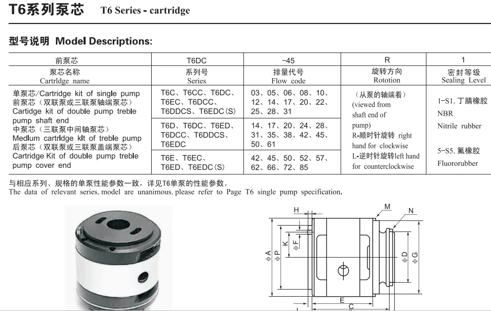 Dennison series T6D/T6C/T6E/T6CC/T6DC/T6EC/T6ED hydraulic vane pump and pump cartrdige kits.
