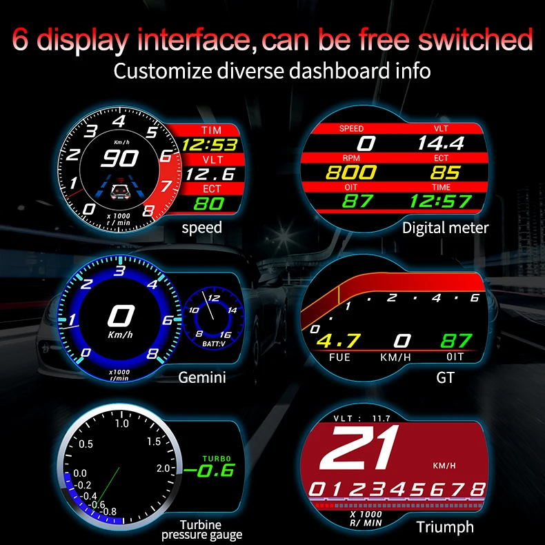 OBD functions: vehicle speed(Km/h or MPH),engine RPM,water temperature(°C or °F),battery voltage,clock, fuel consumption,trip distance ,trip time ,ODO meter, clock,Kilometers per liter ,oil temperature, turbine pressure, air fuel ratio, intake pressure,gps satellite numbers, altitude,driving direction, speed up test, brake test , display detail fault code in text, and clear the fault code,and 48 professional date stream((DTCs Starus, Freeze DTCs, Loop Status, Engine Load,Coolant Temp,Fuel Trim,Fuel Rail Press, Intake Pressure, Tacho, Speed, Ignition, Intake AirTemp, MAF Rate, Throttle Pos, Oxygen Sensor, OBD Type, Aux Input Status, Engine Run time, Mil distance, FRP Ref Manifo, Fuel Level, Warm-ups Count, Distance, Barometric Pre, Air Temperature, Battery Voltage, ODO Distance, Trip Distance, Trip Drive Time, Average Speed, LPH, LHK))