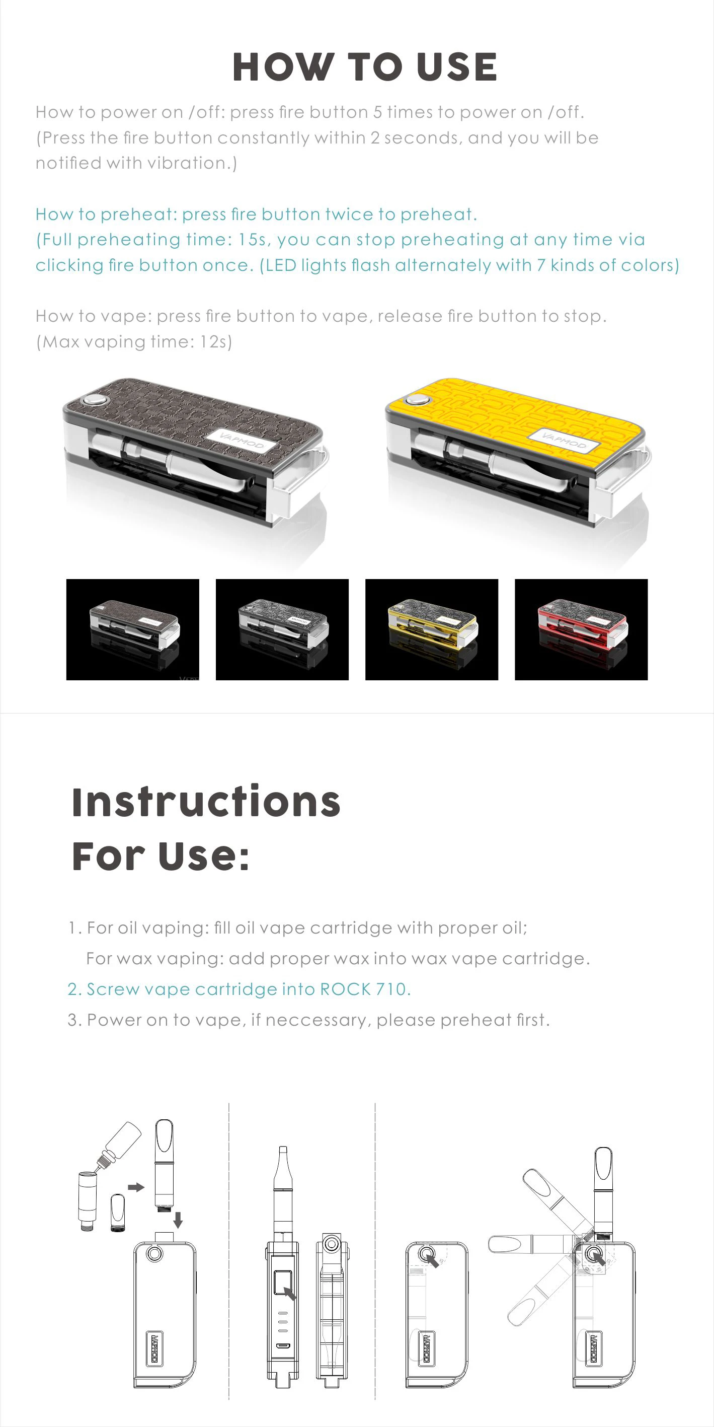 Vapmod Rock 710 is a portable vaporizer with a unique folding design made for use with refillable oil cartridges and wax atomizers. The Rock 710 offers a variety of colorful designs with a bonded leather or polycarbonate finish. The compact design and the folding system of the Rock 710 allows for easy and discreet vaping without any leakage. The Vapmod Rock 710 features a 15-second Smart Pre-Heat Mode and a variable voltage output with four options - 2.5V/3.0V/3.5V/4.0V that will light up with white/blue/green/red LED light accordingly. The powerful built-in 650mAh battery can be quickly recharged with an included micro USB cable in only 1.5 hours. The Vapmod Xtube is compatible with most 510-thread mini atomizers with up to 16mm length and with the resistance range 0.8ohm to 3.0ohm, however, it will work with any cartridge length in open position.