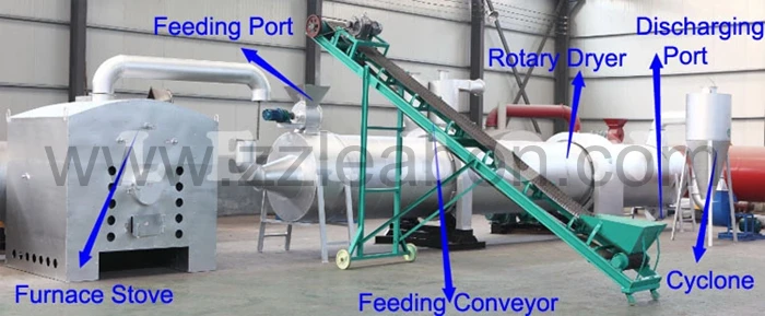 Wood Sawdust Rotary Dryer with heating furnace, feed port, rotating cylinder, delivery pipe, dust collector and discharge port.