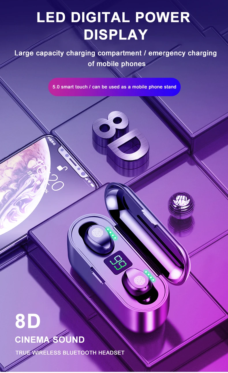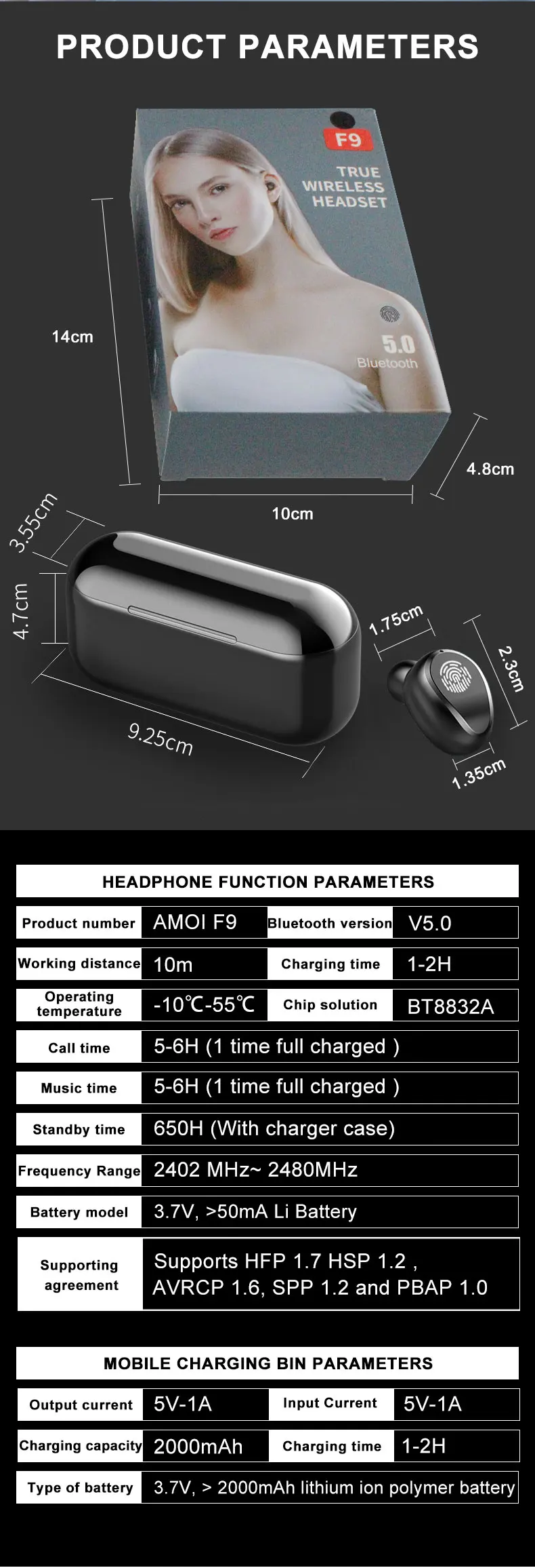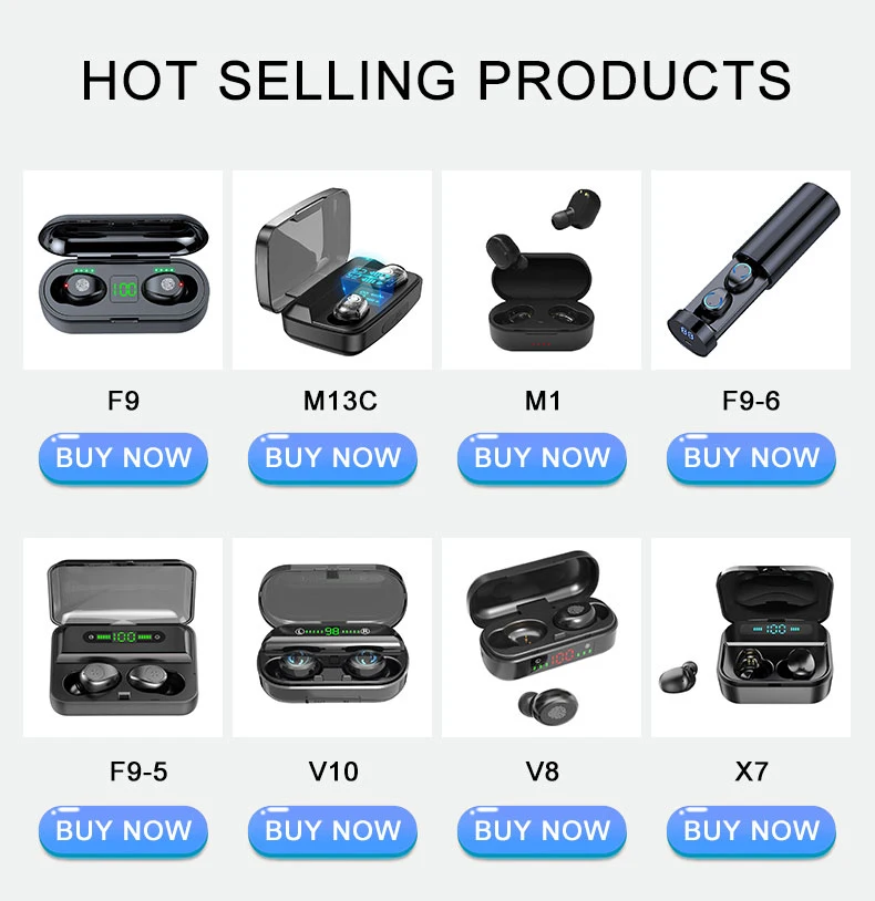 | Package Preview: | ; | Packaging Detail: | F9 TWS IPX7 Waterproof Fone De Ouvido Audifono Wireless Touch Headset Bluetooth Earbuds; |