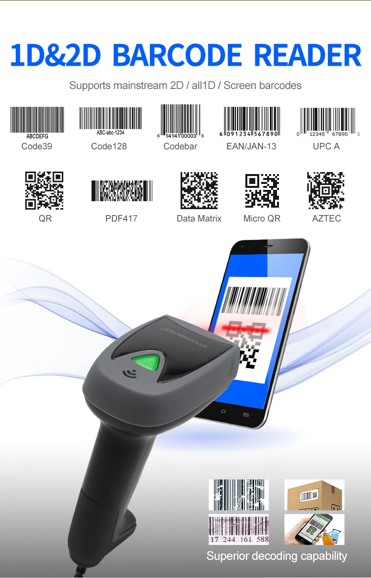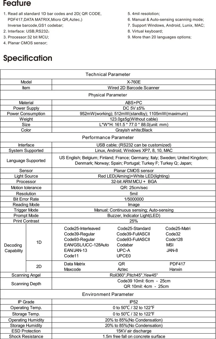 | Type: | Barcode Scanner; | Weight: | 120.0g±5g(Without cable); |