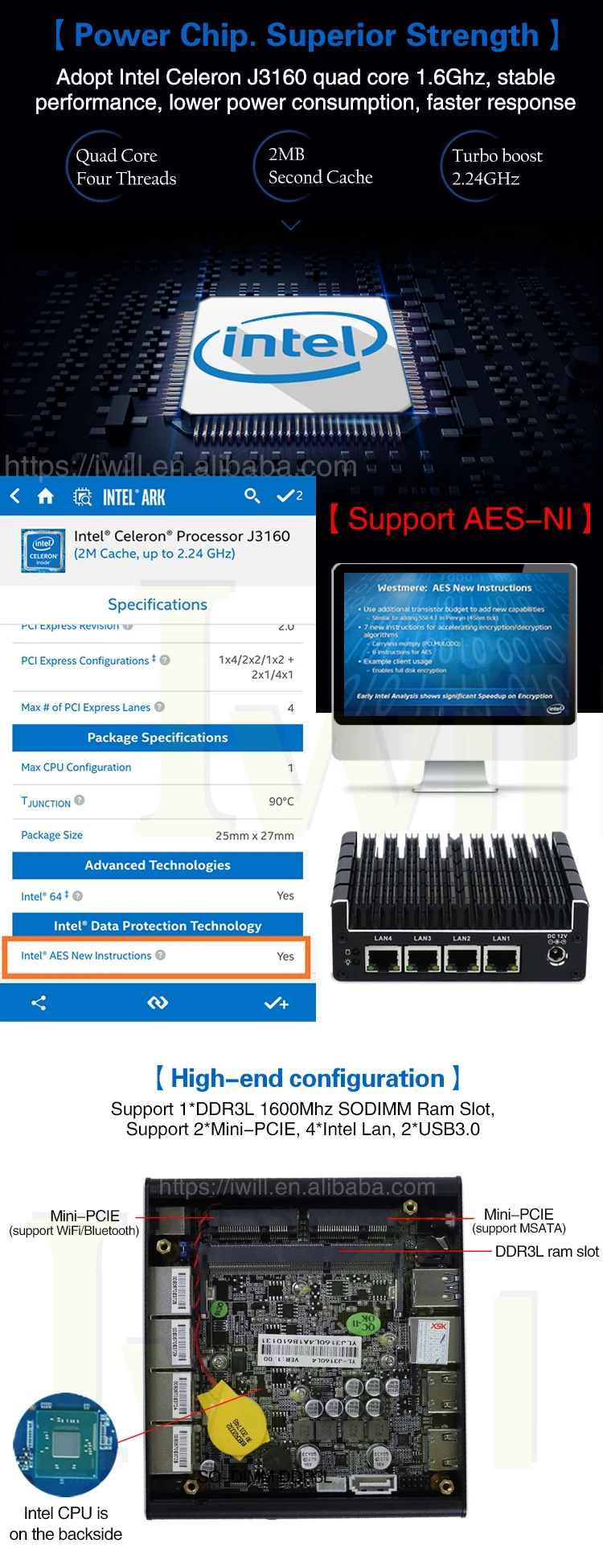 | CPU: | Intel Celeron J3160 Quad Core 1.6Ghz; | Storage: | Support MSATA; |