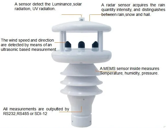 HY-WDS6E Mini automatic weather station is a self-developed professional meteorological sensor for simultaneous measurement of multi-parameters: atmospheric temperature, atmospheric humidity, wind speed, wind direction, air pressure and precipitation.Air temperature, humidity, and pressure measurements are measured by standard industrial MEMS sensor positioned in radiation protection shield. It is characterized by high accuracy and fast response time. Measurement of wind speed and direction is working based on principle of ultrasonic travel time difference. Precipitation is detected by 24G radar, which can rapidly detect precipitation and its intensity. GPS global positioning module and electronic compass are optional to be installed in reserved room, with these two module, you can obtain longitude and velocity accurately, thereby, real and virtual wind speed & direction can be calculated out.