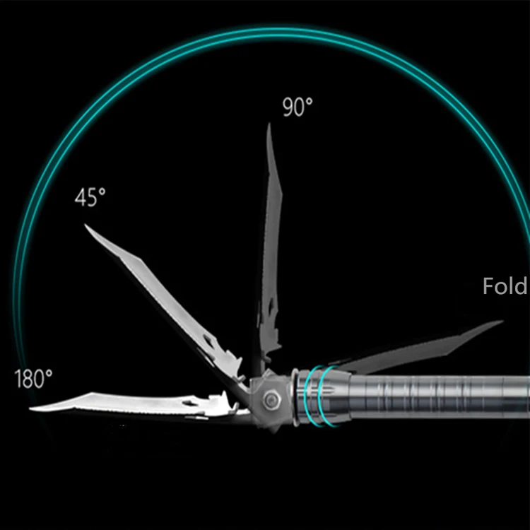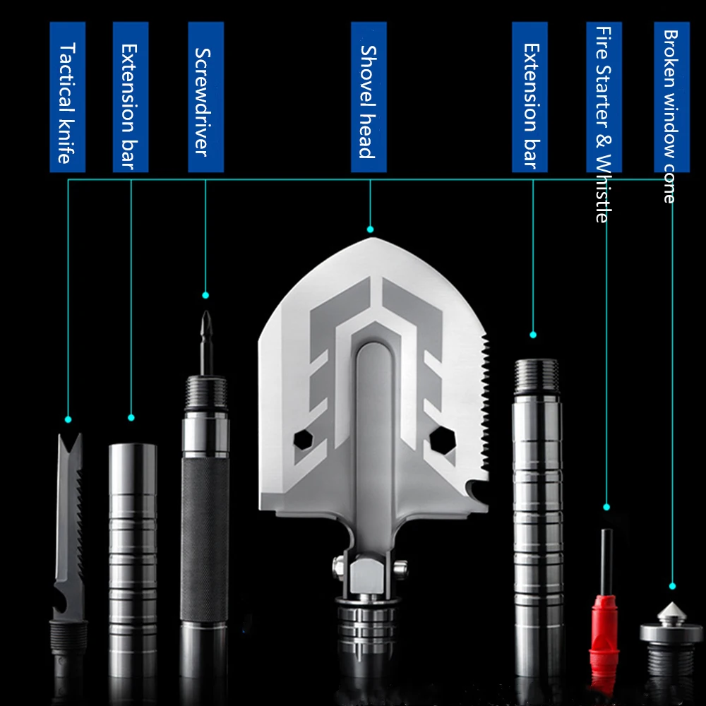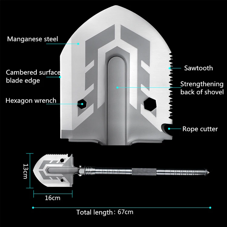 Multi-function Tool, compass, fire starter (Magnesium rob), screwdriver, knife, shovel, bottle opener, rope cutter, saw, chopper All-In-One.