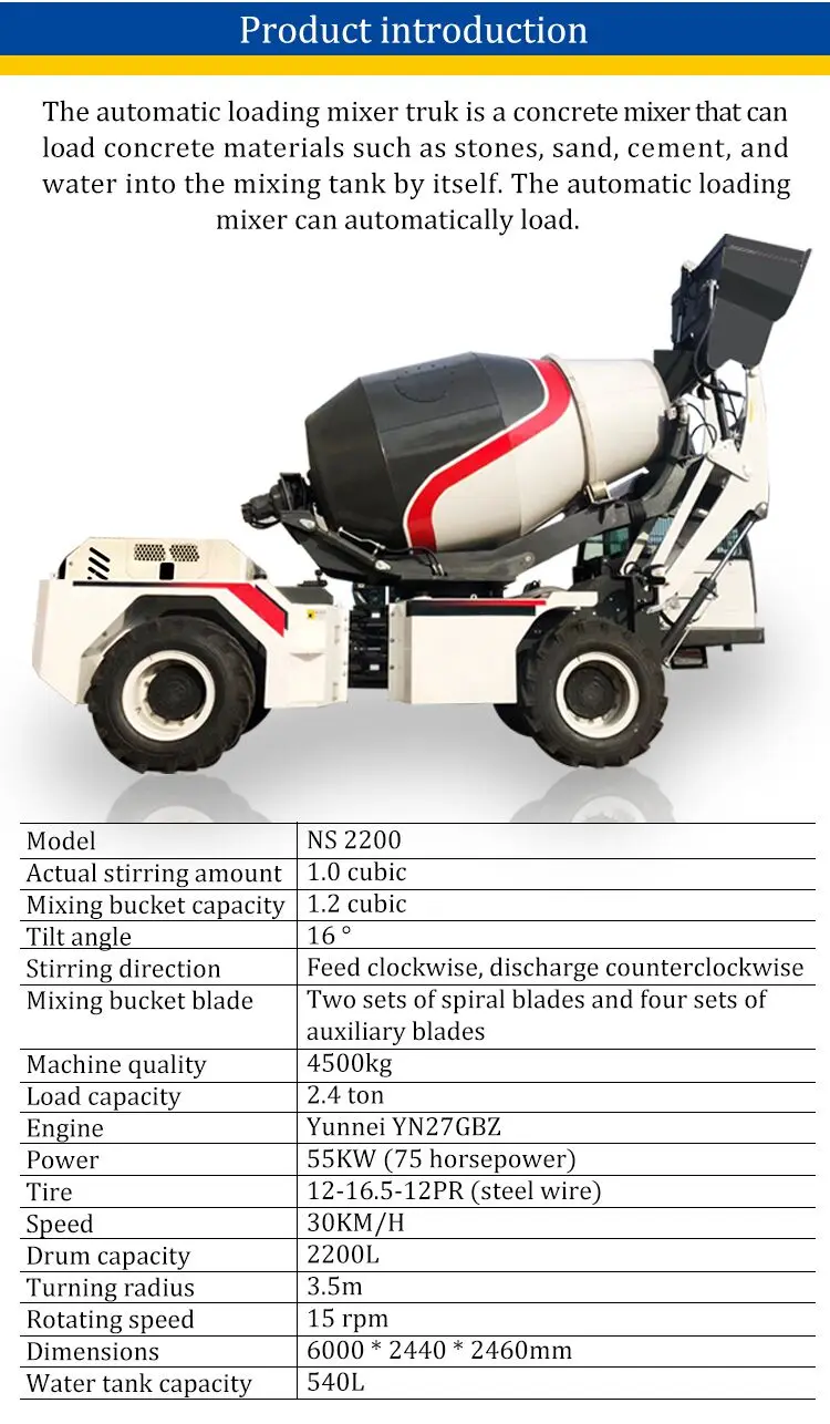 The automatic loading mixer truck is a concrete mixer that can load concrete materials such as stones, sand, cement, and water into the mixing tank by itself. The automatic loading mixer can automatically load.