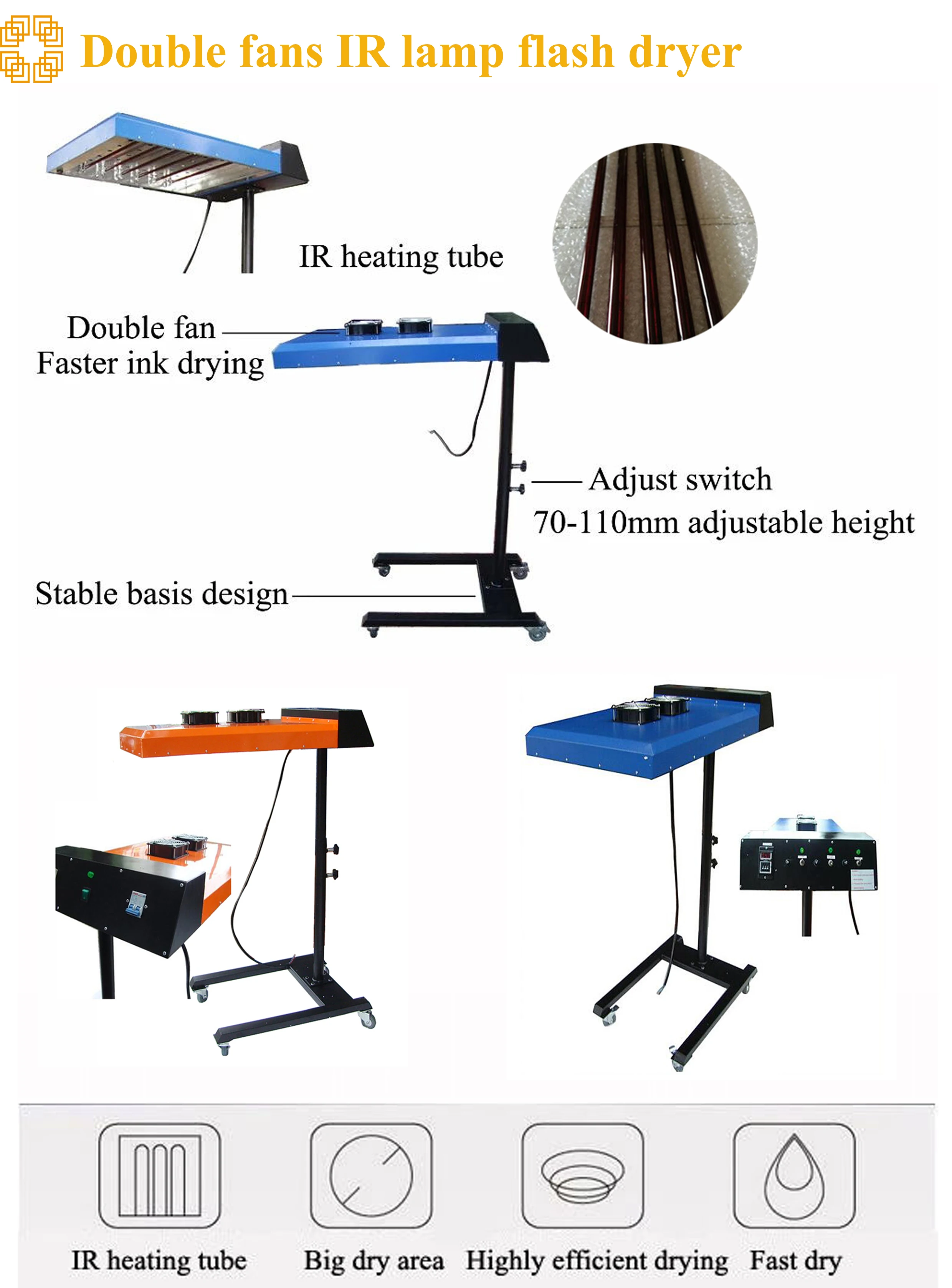 Screen printing flash dryer Model No.:DMD50*60S(orange color) Heating area:500x600mm Voltage:220v,50Hz,3600w Temperature controller:Yes Sensor:No Model No.:DMD50*60C(Blue color) Heating area:500x600mm Voltage:220v,50Hz,3600w Temperature controller:Yes Sensor:Yes Weight:31kg | |