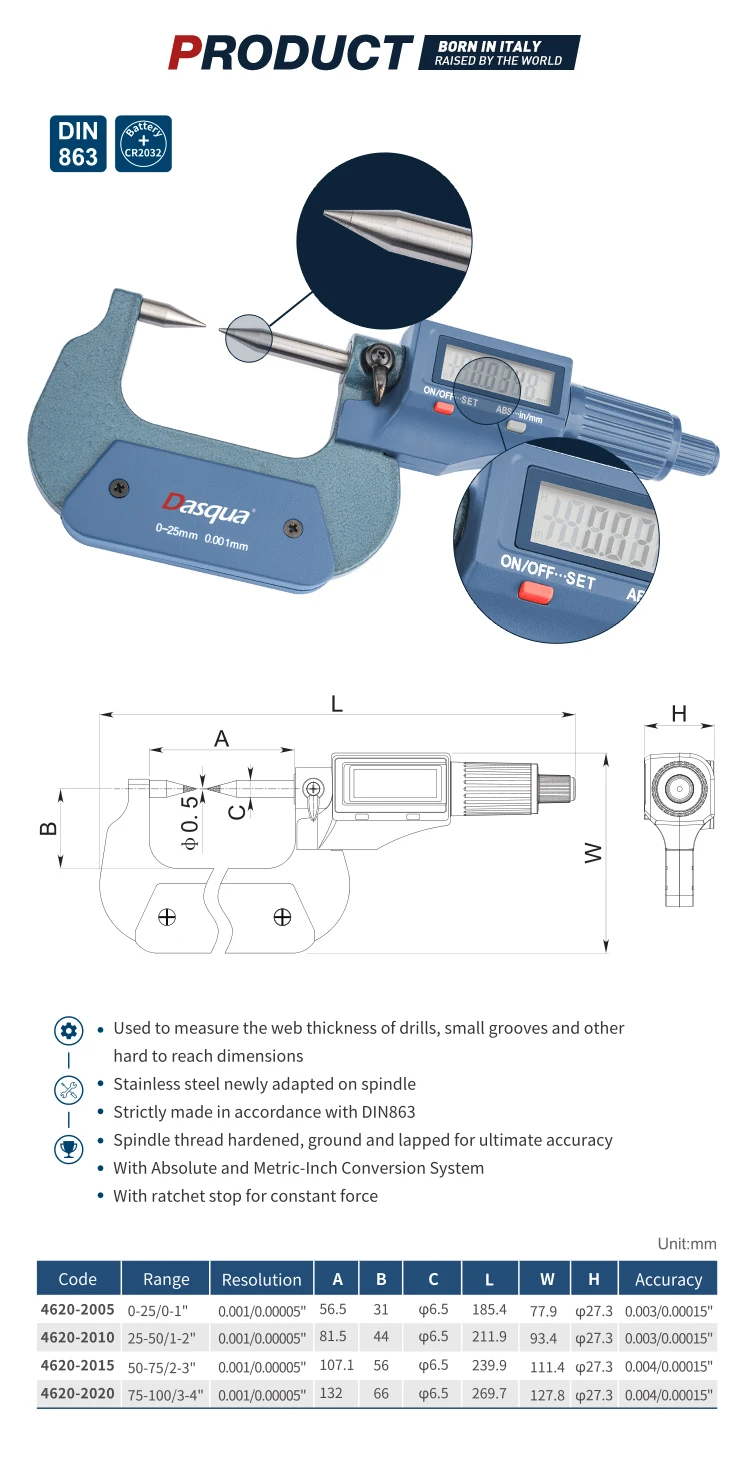 | Customized support: | OEM; | Product name: | Dasqua Stainless Steel Newly 0-25mm Digital Point Micrometer; |