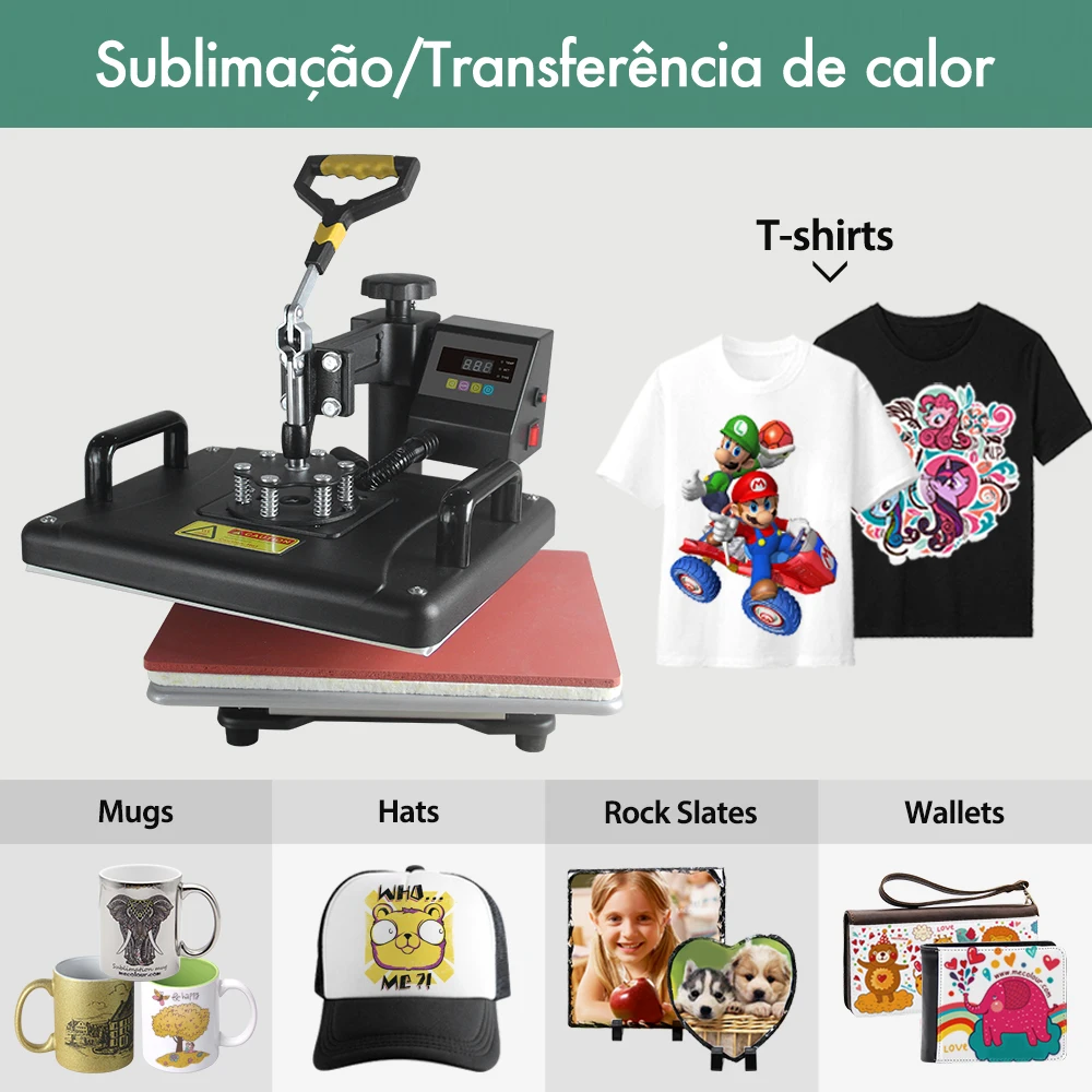 This 8 in 1 heat press machine can be used for T-shirts, caps, ceramic plates, ceramic tiles, mugs, coasters, mouse pads, jigsaw puzzles, lettering, other misc, fabrics & materials. It can transfer colorful pictures and characters of sublimating and dissolved printing ink onto ceramics, glasses and textiles such as cotton, flax, chemical fiber, nylon, etc. This all-in-one press includes flat platen, mugs and plates. The swing-away heat press boasts all of the must-have attachments. It has a built-in Teflon coated 12" × 15" (29 × 38cm) heat platen with a full range of heating coils to allow for consistency throughout its surface. The digital timer control is adjustable up to 999 seconds. The features a digital temperature gauge ranging from 0 - 399ºC