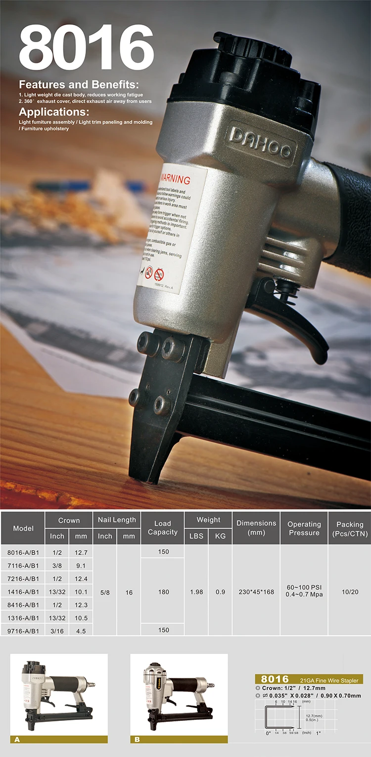| Power Source: | Pneumatic,Pneumatic; | Nail Length: | 5mm(1/5'')-16mm(5/8''); |