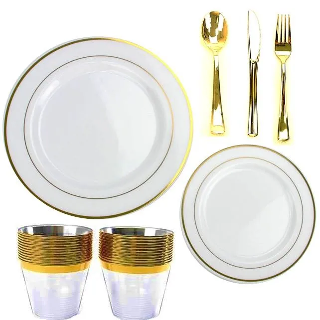 White Plastic Wedding Party Dinner Set with Gold Rim