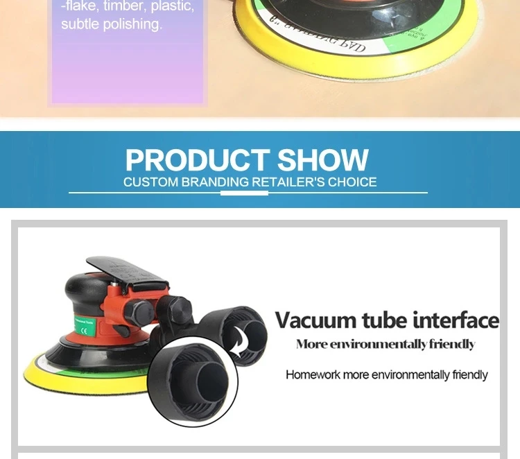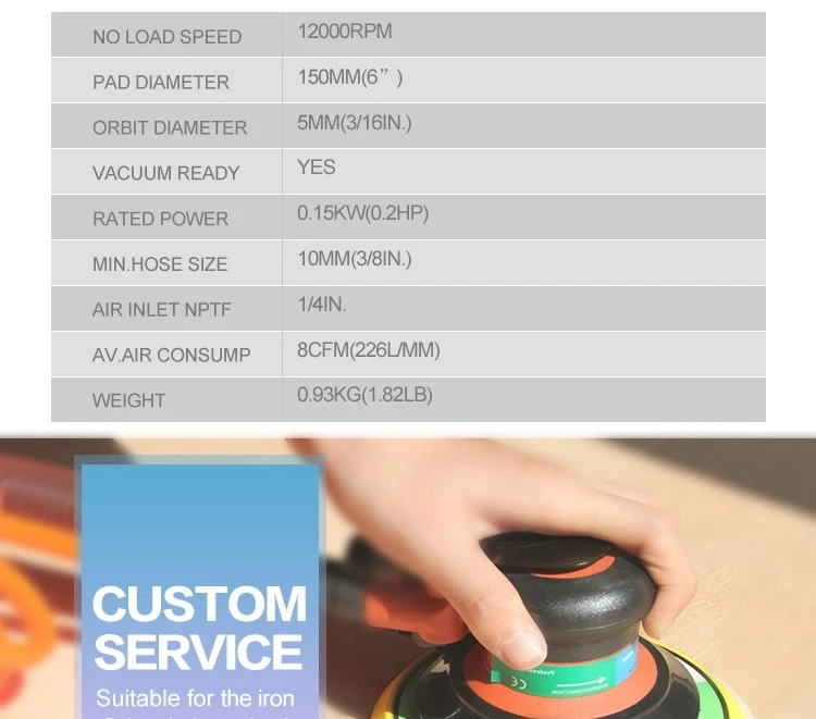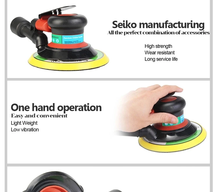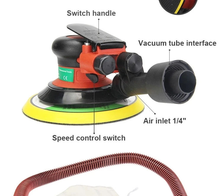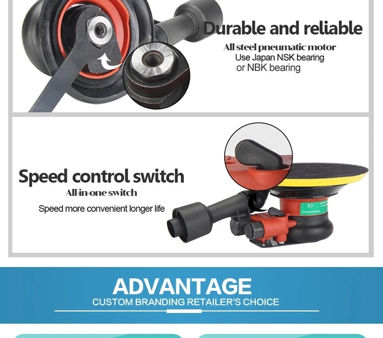 It is professional high quality air tool with speed control lever, compact structure. Scientific design, unique motor, shaft balancer, hard steel alloy cylinder, high quality plastic rotor, rear exhaust. This product is ideal for car body shops, metal work, furniture, etc.