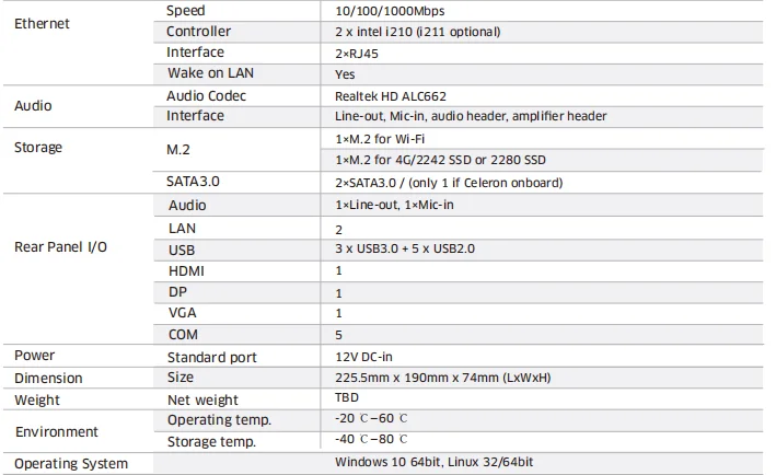 | Ethernet Controller: | 2 Intel i210(i211 optional); | Wake on LAN: | Yes; |